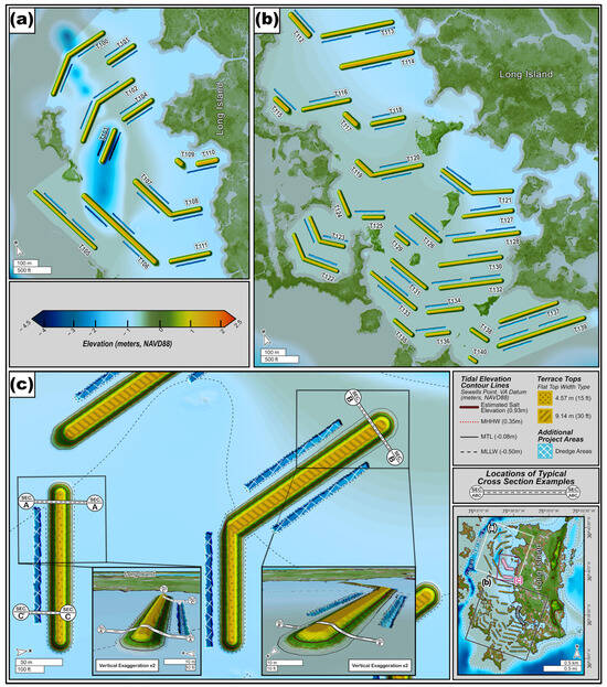 Terrace elevations were derived from design specifications detailing cross-sectional horizontal and vertical dimensions, slope gradients, and ecological zones corresponding to tidal marsh classifications (Figure A4). The dimensions specified in the terrace blueprints were used to determine the locations of elevation adjustments required to represent the new structures in the DEM. For instance, a 4.57 m terrace top required an extrusion height of 2.29 m from the seabed (Figure A4a), while a 9.14 m terrace top required a height of 2.44 m (8 ft) (Figure A4b). At designated dredge zones, 1.83 m (6 ft) was subtracted from the baseline DEM’s bathymetry (Figure A4c). All terraces incorporated a consistent slope gradient of 1:3 (vertical: horizontal), achieved in the modified DEM by correctly placing terrace slope elevations to create uniform transitions from each terrace toe to the top. Contour lines overlaying terrace features in the inset maps of Figure 5c are labeled with corresponding elevations extruded from the seafloor.
