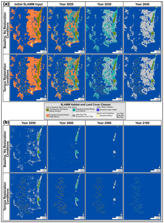 Output SLAMM habitat coverage maps at Bonney Cove under simulations with baseline, no restoration conditions versus simulations with proposed terrace restoration conditions. Comparisons in (a) show the model input datasets and projections for decades 2020, 2030, and 2040, followed by comparisons in (b) showing projections for the decades 2050, 2060, 2080, and 2100.