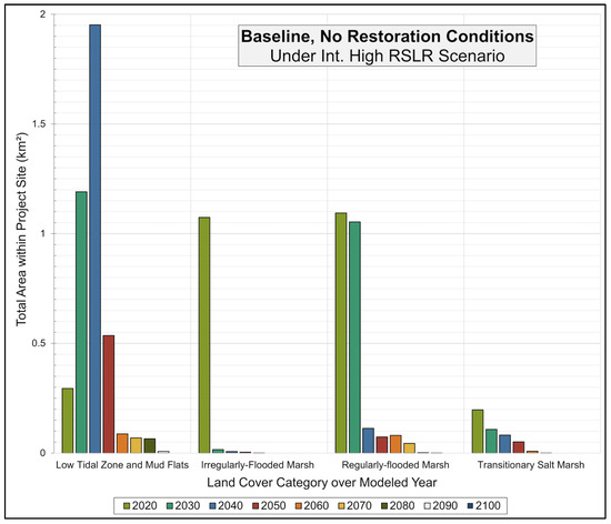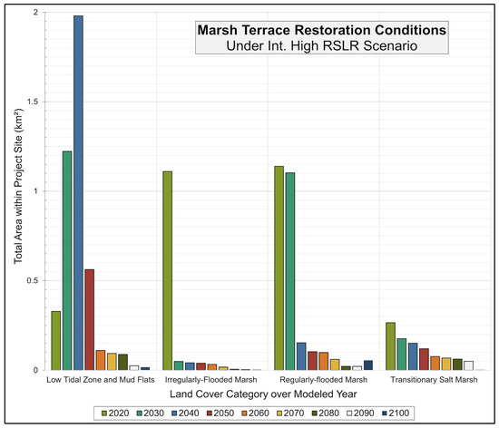 Modeling results for the baseline scenario where no terrace restoration has been implemented reveals that all the preexisting marsh classes evaluated are vulnerable to the SLR scenario used in the study and are predicted to lose 100% of their area by 2100 (Figure 9).