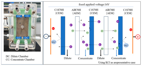 A lab-scale ED stack (TWED-2-10, Shandong Tianwei Membrane Technology Co., Ltd., Weifang, China) was utilized, equipped with homogeneous cation-exchange membranes (CEM: C1S70H) and anion-exchange membranes (AEM: AIR70H). Key membrane properties are summarized in Supplementary Table S1. The membranes exhibit high transport numbers (>0.98), confirming excellent permselectivity. Their low area resistance and controlled water content (15–20 wt%) suggest inherent anti-fouling potential, while the specified operating temperature range ensures stability under experimental conditions. The assembly featured a dual-compartment configuration consisting of 10 membrane pairs. Each membrane possessed an effective area of 0.0084 m2 with the flow rate of the electrode solution of 6 cm/s. Prior to assembly, ten AEMs and eleven CEMs were soaked in water. These membranes subsequently separated the concentration and dilution compartments, respectively, before the membrane stack was put together. The experimental setup and separation mechanism of ED are illustrated in Figure 1 [31].