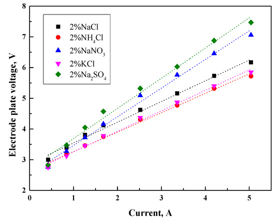 Prior to conducting desalination–concentration experiments, electrolyte solutions with varying mass concentrations were prepared, including 2% (w/w) NaCl, 2% NaNO3, 2% NH4Cl, 2% KCl, and 2% Na2SO4. The electrode plate voltage of each solution was systematically measured under standardized conditions.