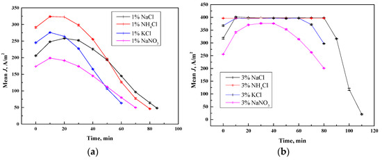 Figure 3 illustrates the temporal variation in J during the ED of various monovalent salt with error bars. The results indicate that for each monovalent salt system, the SD remained within 0.86%~1.58% during desalination phase, and 0.37%~1.18% during concentration phase, reflecting stable data reproducibility. During desalination phase, the values for all four salts first exhibited an initial increase to a peak value, followed by a gradual decline over the experimental duration. Notably, NH4Cl yielded the highest J, reaching a maximum of 323.8 A/m2 around 10 min into the process. This can be attributed to the superior ionic conductivity of NH4Cl solution, which facilitates a higher ion migration rate in the initial stages, thereby resulting in a larger current density. As the ion concentration in the dilute chamber diminishes, the driving force for ion migration weakens, leading to a decrease in J [23]. In summary, the current densities were ranked as follows: NH4Cl > KCl > NaCl> NaNO3. Except NaCl, the remaining three salts achieved their peak current densities around the 10 min mark.