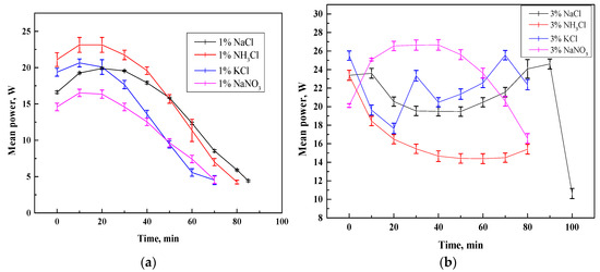 Temporal evolution of power during ED process with error bars. Error bars represent ± SD from triplicate experiments (n = 3). (a) Desalination phase. (b) Concentration phase.
