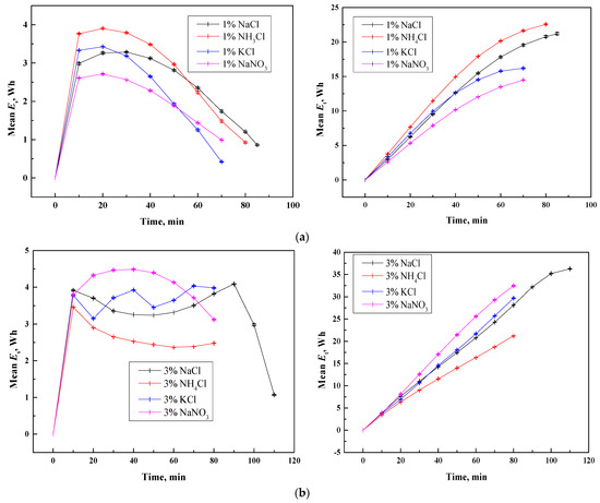 As shown in Figure 5a, all four monovalent salts exhibited a progressive decrease in Es throughout the desalination process. During the initial desalination phase, NH4Cl exhibited the highest initial average Es of 3.77 Wh, coupled with the most rapid decline rate. Correspondingly, NH4Cl also displayed the highest Et value, a phenomenon potentially attributable to supplementary energy expenditure from hydrolysis reactions. The subsequent Es showed NaCl and KCl occupying intermediate positions, with NaNO3 exhibiting the lowest Et value. Notably, NaNO3 maintained the lowest Es values throughout the process, manifested the slowest rate of decline, and ultimately achieved the most favorable total energy consumption among the four salts.