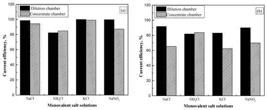 Comparison of current efficiency in two phases. (a) Desalination phase. (b) Concentration phase.