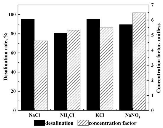where and represent, respectively, the concentration of monovalent salts before desalination and after desalination, g/L, which are calculated based on Table 1.