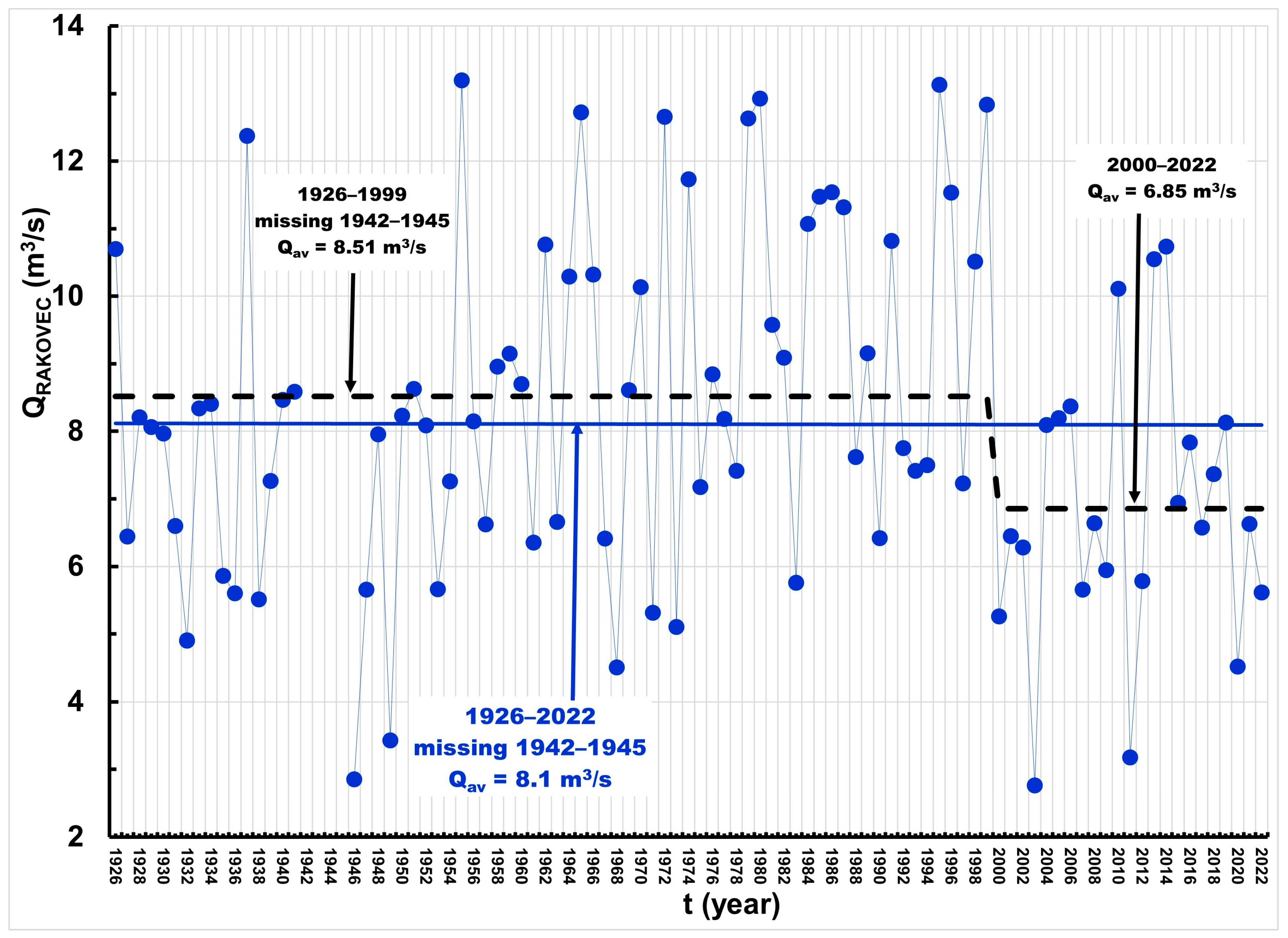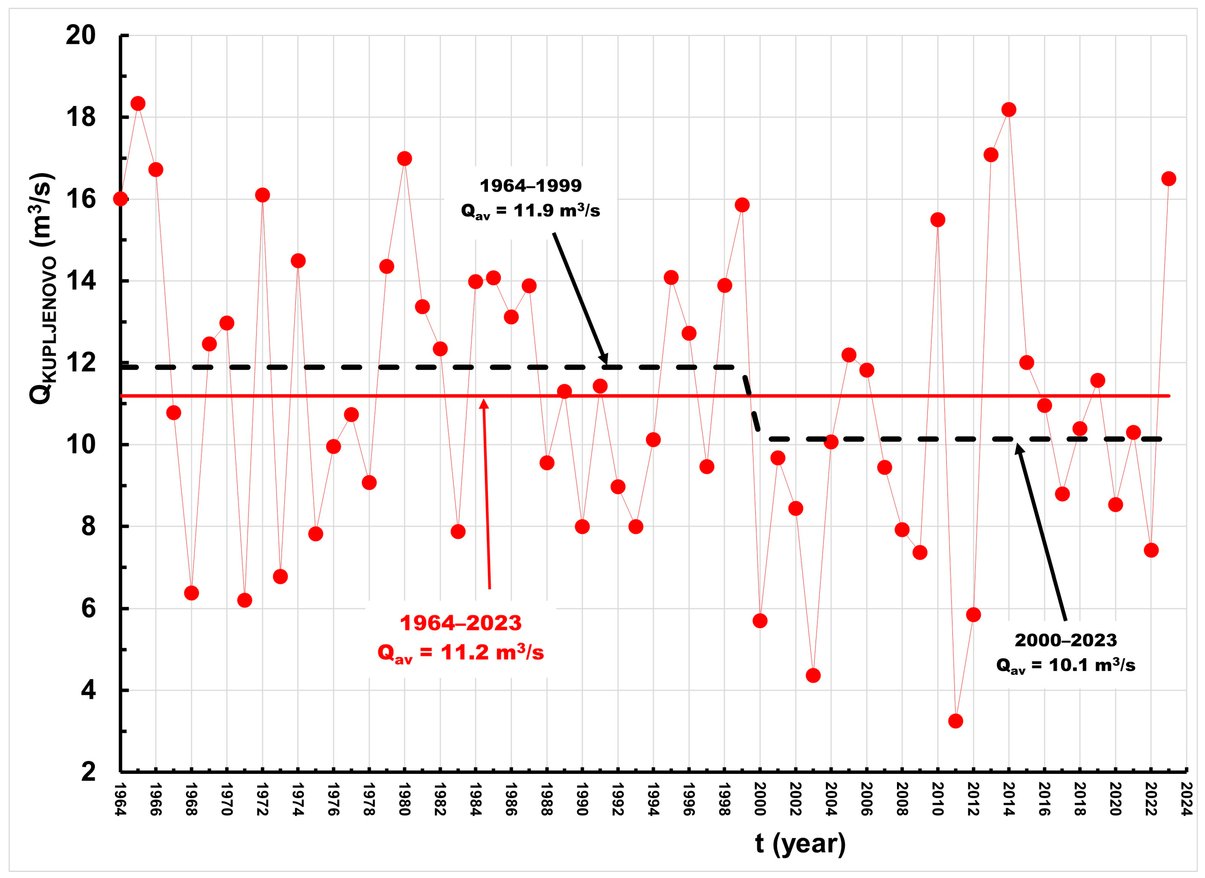 - Stojilković, B.; Brečko Grubar, V. Discharge regimes of Slovenian rivers: 1991–2020. Acta Geogr. Slov. 2024, 64, 7–31. [Google Scholar] [CrossRef]