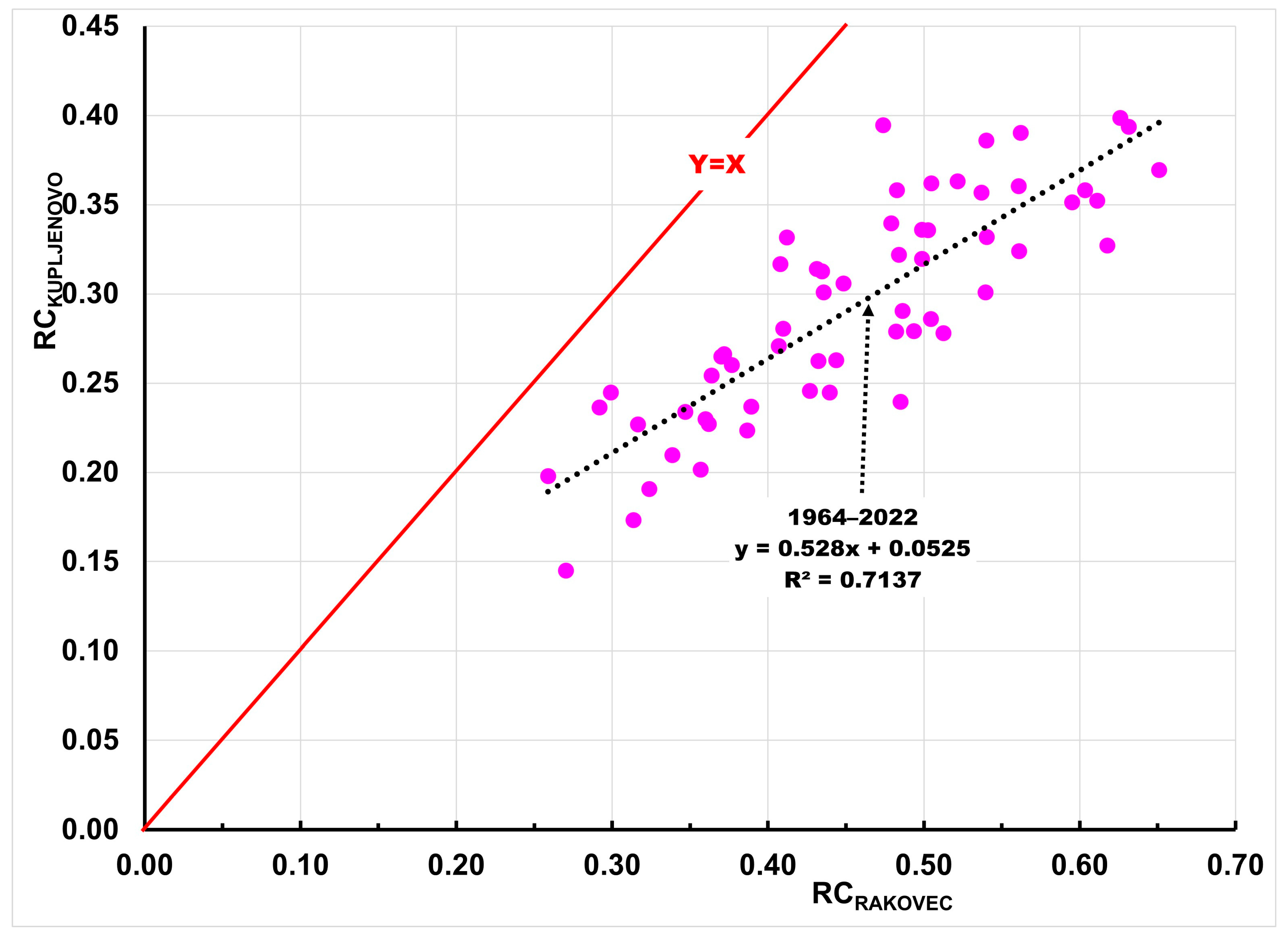- The Krapina basin, characterized by permeable soils and gentler slopes, shows lower runoff coefficient values and higher infiltration losses.