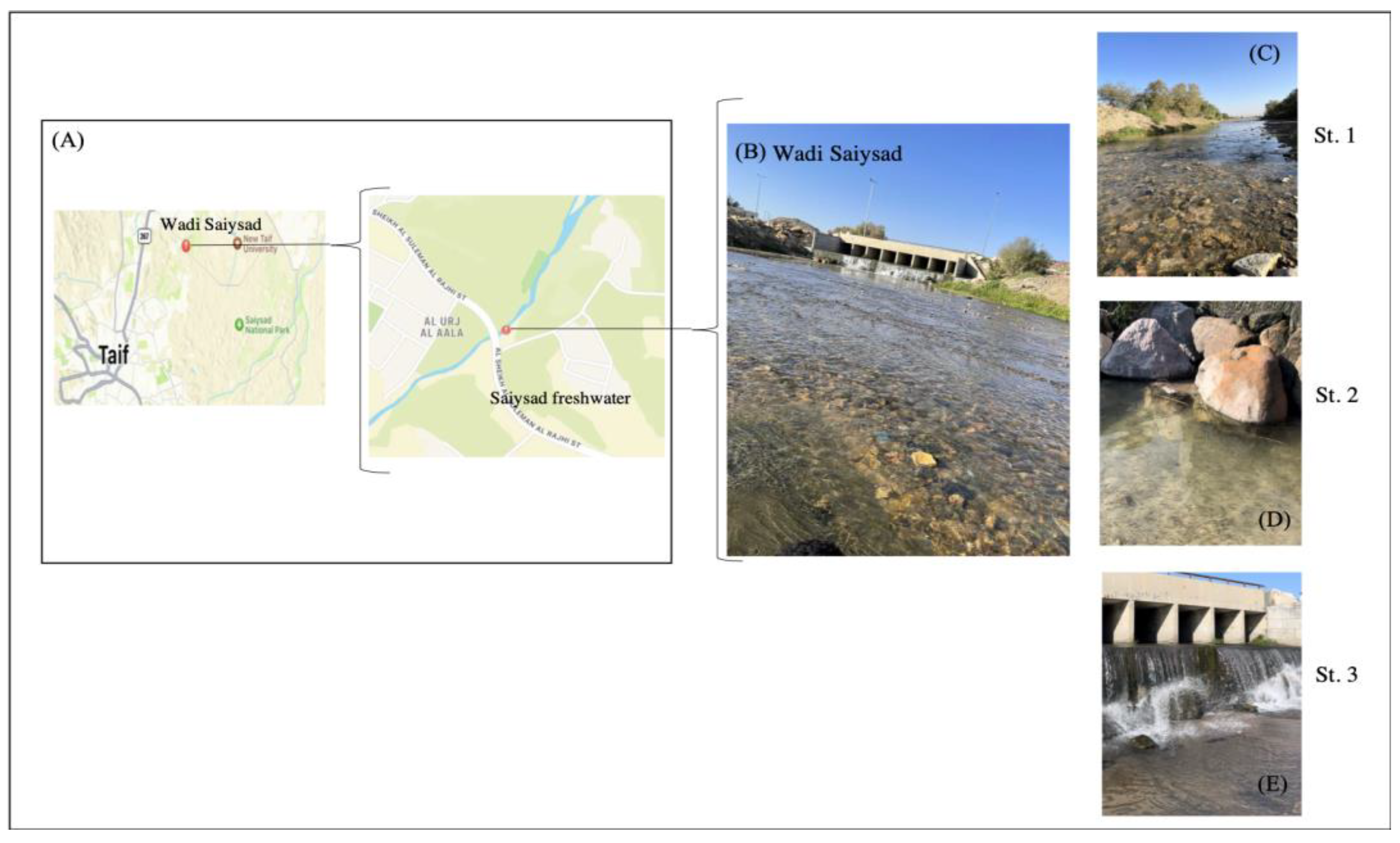 - Aqel, H.; Sannan, N.; Al-Hunaiti, A.; Fodah, R. Integrated water quality dynamics in Wadi Hanifah: Physical, chemical, and biological perspectives. PLoS ONE 2024, 19, e0298200. [Google Scholar] [CrossRef]