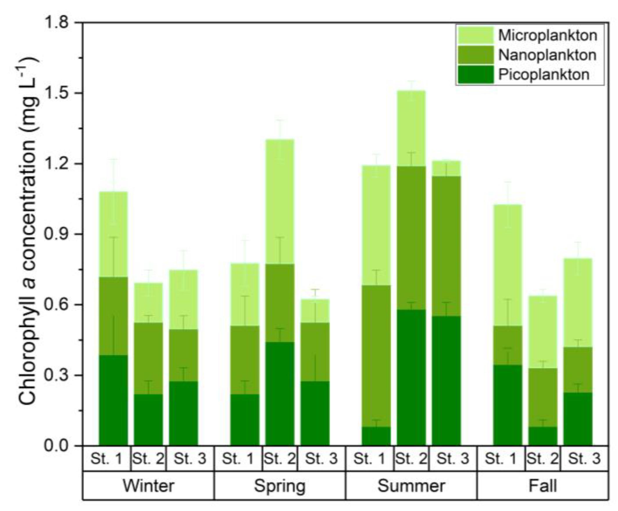 3.2. Total and Size Fractionated Chlorophyll a Concentration