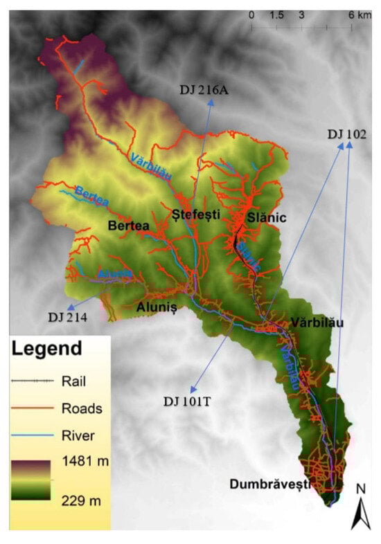 24]. Bertea and Ștefești show average road density, whereas Lutu Roșu, in the northern part of the catchment, has relatively low road density. The primary road in the catchment is County Road DJ 102, which connects Slănic with Dumbrăvești in the south and provides the main route to Ploiești, the nearest major city.