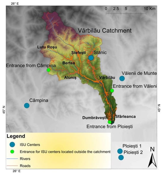 No multiplier was applied to the Slănic center, as it is a minor facility located within the Vărbilău Catchment. Similarly, the Câmpina center, although a major facility, was not weighted because of its distance from the catchment (approximately 20 km) and its limited accessibility via a winding, hilly route. In contrast, the Vălenii de Munte center, located only 5 km from the catchment boundary and benefiting from easier access, was assigned a multiplier of 2. The Ploieşti center, situated about 12 km away and hosting two major ISU detachments, was given the highest weight, with a multiplier of 4 [