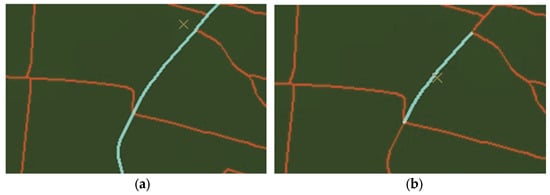 Figure 5a illustrates a road segment with an incorrect network topology. Each line representing a road must terminate at a junction point to ensure proper connectivity, meaning each road should exist as a segment between two junctions. At a cross-shaped (“x”) intersection, for example, all road segments must meet at a single point.