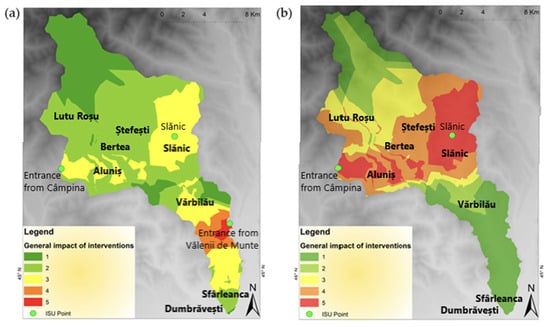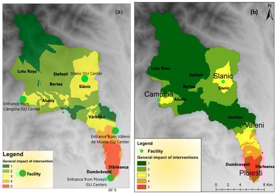 Figure 9b, which shows the reclassified accessibility map when only the Slănic and Câmpina ISU centers are operational. The best-served areas (scores 4 and 5) include Aluniş, Ostrovu, and Slănic, benefiting from their proximity to the Slănic center and the Câmpina entrance point. However, this does not imply superior service compared to Scenario 1, when the Ploieşti and Vălenii de Munte centers were still active. In this scenario, the southern part of the catchment becomes the least served (scores 1 and 2), since two critical centers—Ploieşti and Vălenii de Munte, both essential due to their equipment and closeness to densely populated zones—are excluded. For instance, Dumbrăveşti and Vărbilău village, with higher population densities, experience a substantial decline in accessibility. Vărbilău, in particular, scores only 1–2, corresponding to intervention times exceeding 40 min from Slănic [