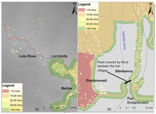 Figure 10b). Under normal conditions, ISU crews from Ploieşti can reach Dumbrăveşti in less than 10 min and Sfârleanca within 10–20 min. However, when floodwater submerges the road, crews are forced to reroute northward, extending travel times to approximately 40 min. Flood modeling [