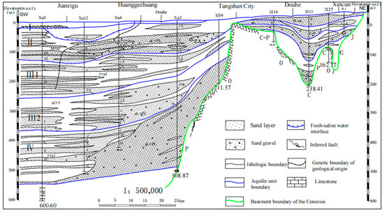 The aquifer system is dominated by Quaternary unconsolidated porous media, with increasing sediment thickness from north to south, reaching up to 500 m in the coastal zone. The aquifer media are composed of multilayered and heterogeneous materials, including medium to fine sand, gravel, pebble conglomerate, and silty clay. Based on hydraulic connectivity and burial depth, the aquifer system can be divided into four groups (I–IV). The shallowest, the first aquifer group (Group I), is the focus of this study, with burial depths ranging from 10 to 60 m and widespread spatial distribution. The representative hydrogeological cross-section of the study area is shown in Figure 1, illustrating the multilayered aquifer structure and hydrogeological zoning controlled by geomorphological units.