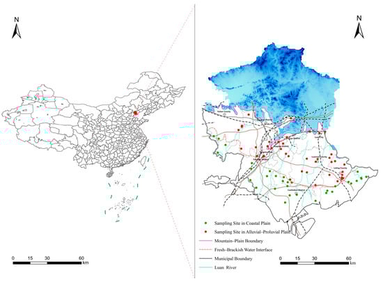 Tangshan City is located at the northeastern margin of the North China Plain and represents a typical convergence zone between alluvial and coastal plains [1]. The shallow groundwater in this region has long served as a vital source for agricultural irrigation, industrial production, and urban water supply. However, with increasing population, industrial agglomeration, and changes in agricultural practices, the groundwater system is under mounting pressure from overexploitation, declining water tables, and deteriorating water quality [2,3,4]. According to the Geological Environment Monitoring Report of Tangshan City, Hebei Province (2016–2020), groundwater withdrawal has consistently exceeded recharge, resulting in the formation of localized groundwater depression cones, ground subsidence, and earth fissures [5]. Therefore, elucidating the hydrochemical characteristics and evolution mechanisms of groundwater is crucial for achieving sustainable groundwater management and effective pollution prevention in the region.
