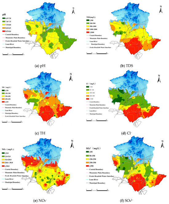 To identify the spatial variability of groundwater quality and its potential driving factors, six representative hydrochemical parameters—pH, total dissolved solids (TDS), total hardness (TH), Cl−, NO3−, and SO42−—were selected for spatial interpolation using the inverse distance weighting (IDW) method in ArcGIS 10.8 (Figure 4a–f).