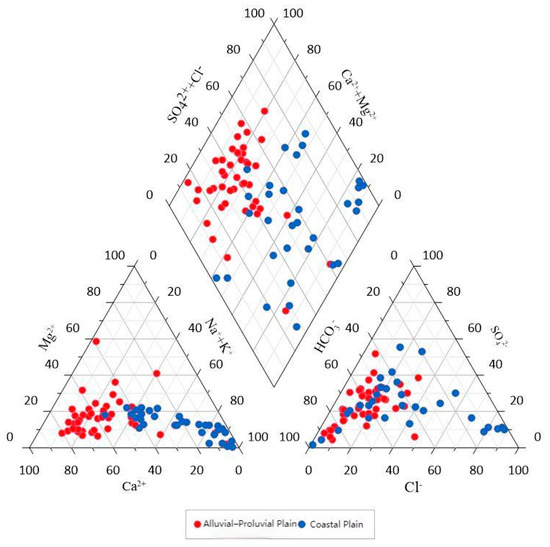 The Piper diagram reveals that groundwater in the alluvial plain is primarily of the Ca2+–Mg2+–HCO3− and Ca2+–Mg2+–SO42− types. Most samples are concentrated in the lower left corner of the cation triangle and the upper left corner of the anion triangle, indicating favorable recharge conditions, carbonate-dominated lithology, and a relatively low degree of chemical evolution. A subset of samples shows elevated SO42− concentrations, which may be related to the dissolution of sulfate minerals or oxidation of sulfides. In contrast, samples from the coastal plain are mainly located in the Na+–Cl− field, indicating high mineralization levels and reflecting the dominant influence of seawater mixing, evaporation concentration, and dissolution of evaporite minerals (Figure 5).
