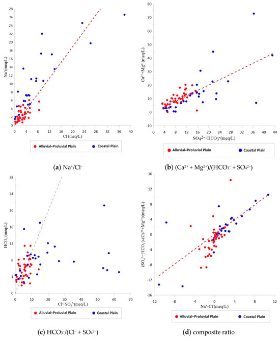 The (Ca2+ + Mg2+)/(HCO3− + SO42−) ratio reflects the dissolution status of carbonate and sulfate minerals. Most samples are distributed near the 1:1 line, suggesting an overall electrochemical balance between cations and anions. In the alluvial plain, the ratio is dominated by samples with low concentrations, indicating carbonate dissolution as the primary control. In the coastal zone, elevated ratios suggest enhanced external SO42− input, potentially influenced by industrial discharge or sulfide oxidation. A similar contribution of external SO42− has been verified in coastal aquifers of central Ghana [59].