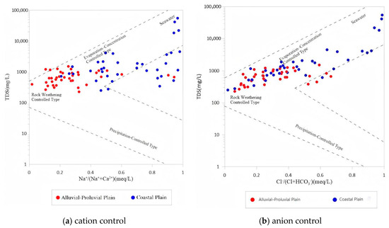 The Na+/Cl− ratio is primarily used to identify seawater mixing and cation exchange processes. Most groundwater samples in the study area plot close to the Na+/Cl− = 1 line, indicating a high degree of source consistency between the two ions. In the alluvial plain, most samples fall below the 1:1 line, suggesting slight Na+ depletion, which may result from Na+–Ca2+ exchange adsorption. In contrast, most samples in the coastal plain plot above the 1:1 line, showing Na+ enrichment, which indicates the significant influence of seawater intrusion or salt mineral dissolution. This classification logic is consistent with the findings of Selvakuma et al., who identified the Na+/Cl− ratio as a key indicator for distinguishing between evaporite dissolution and seawater mixing in coastal aquifers of southern India [58].