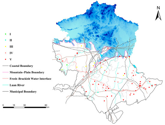 According to the Groundwater Quality Standard of China (GB/T 14848—2017) [65] and based on the concentrations of major hydrochemical constituents (excluding pH), the groundwater quality in the study area was classified into five categories: Classes I–II represent high-quality water with low solute concentrations and are suitable for various uses; Class III represents moderate-quality water, suitable for drinking water sources and agricultural or industrial use; Class IV represents poor-quality water, suitable for agricultural and some industrial use and can be used as drinking water after treatment; and Class V represents very poor-quality water with high solute concentrations, which is not suitable for drinking. A total of 76 shallow groundwater samples from the study area were classified into these quality categories (Figure 8). The results show that groundwater quality varies significantly across the region, exhibiting an overall pattern of better quality in the north and poorer quality in the south, with a gradual transition from fresh to mineralized water.