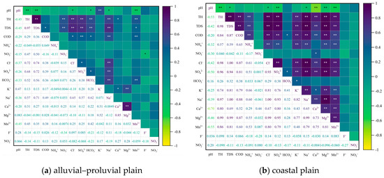 The pH values in both zones ranged from neutral to slightly alkaline. In the alluvial plain, pH ranged from 7.00 to 8.50, while in the coastal plain, it ranged from 6.90 to 8.60. The majority of samples met the Class III quality standard. Significant differences were observed in total dissolved solids (TDS) and total hardness (TH) between the two zones. In the alluvial plain, the mean TDS was 715.54 mg/L and TH was 511.86 mg/L, whereas in the coastal plain, the average TDS increased to 5781.20 mg/L and TH reached 1449.98 mg/L. The exceedance rates for TDS and TH in the coastal zone were 75.00% and 34.38%, respectively. With respect to ion concentration rankings, the anion sequence in the alluvial plain was HCO3− > SO42− > Cl− > NO3− > NO2−, and the cation sequence was Ca2+ > Mg2+ > Na+ > K+ > NH4+. In contrast, the coastal plain exhibited an anion sequence of Cl− > SO42− > HCO3− > NO3− > NO2−, and a cation sequence of Na+ > Mg2+ > Ca2+ > K+ > NH4+. Regarding pollution-sensitive indicators, the exceedance rates for NO3−, NH4+, and Mn in the alluvial zone were 31.82%, 11.36%, and 54.55%, respectively. In the coastal zone, the exceedance rates for NO3−, Mn, F−, and Mg2+ were 21.88%, 46.88%, 31.25%, and 68.75%, respectively.