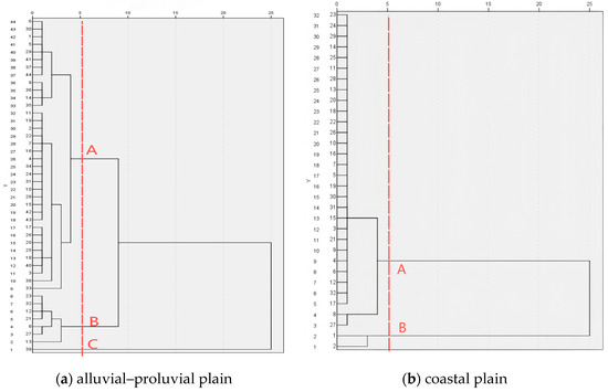 where A and B are the two clusters to be merged, ∣A∣ and ∣B∣ represent the number of samples in each cluster, and XAi and XBi denote the centroids of clusters A and B, respectively. By constructing a dendrogram, groundwater samples can be effectively grouped based on similarity, which—when integrated with their geographic locations and hydrochemical characteristics—enables further classification of water quality types and delineation of potential contamination zones.