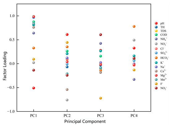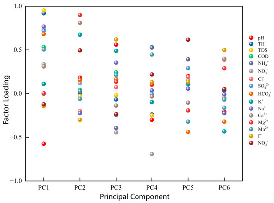 Principal component analysis (PCA) is a dimensionality reduction technique that transforms multiple original variables into a set of mutually orthogonal new variables (principal components), thereby reducing the dimensionality while retaining as much of the original information as possible [55]. In this study, PCA was employed to extract the dominant factors controlling groundwater hydrochemical variations and to identify potential pollution sources.