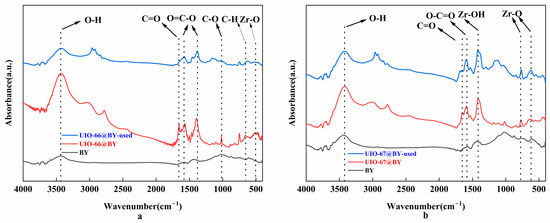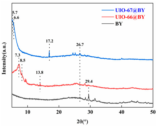 3.1. Characterization of BY, UIO-66@BY, and UIO-67@BY
