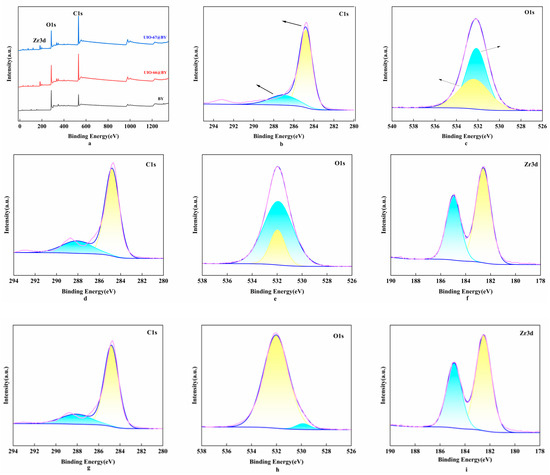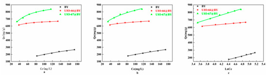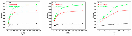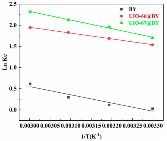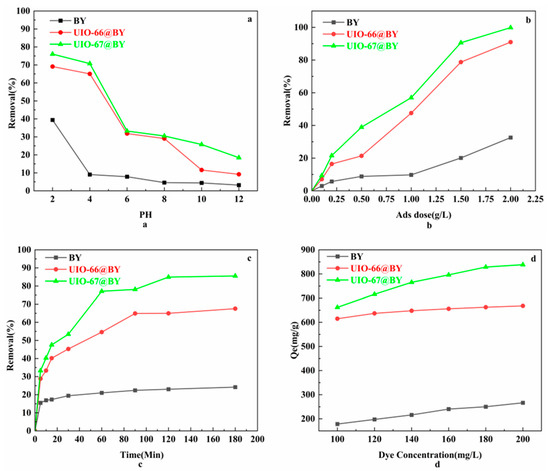 3.2. BY, UIO-66@BY, and UIO-67@BY Study on Adsorption Performance
