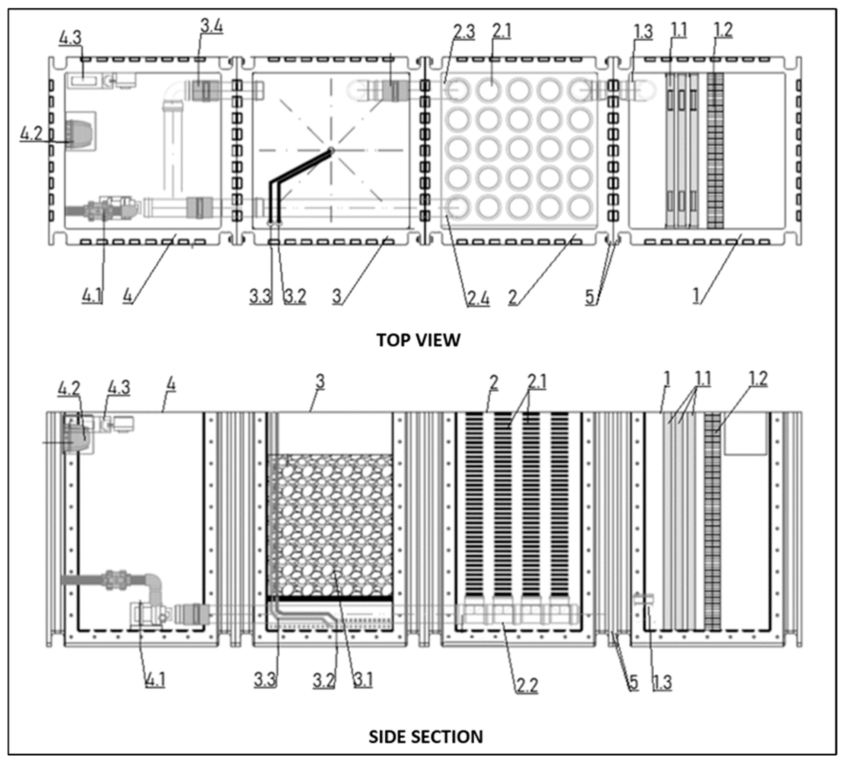 Both the design and the prototype of the filter chamber were implemented according to the co-authors’ guidelines by a competent technology company and analyzed in terms of functionality, mechanical loads, and safety of use. It therefore meets the basic requirements for modularity and multiplicity (compatibility of multidirectional system connections), durability and lightness of construction (HDPE plastic), functionality in relation to various types and sizes of swimming ponds, the possibility of independent assembly and equipping the system with dedicated accessories, as well as service and maintenance facilities, allowing individual chambers to be disconnected without immobilizing the entire system.