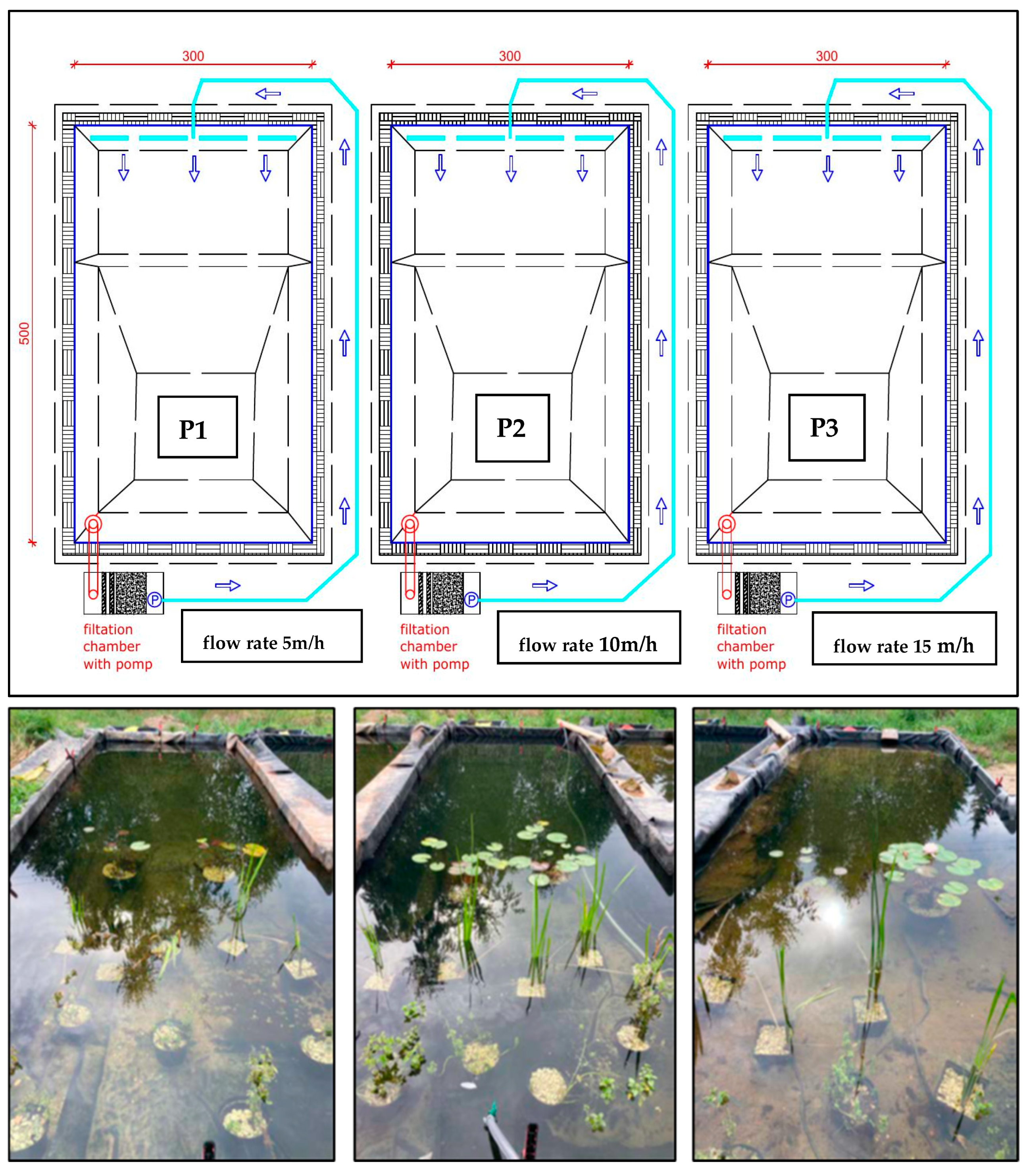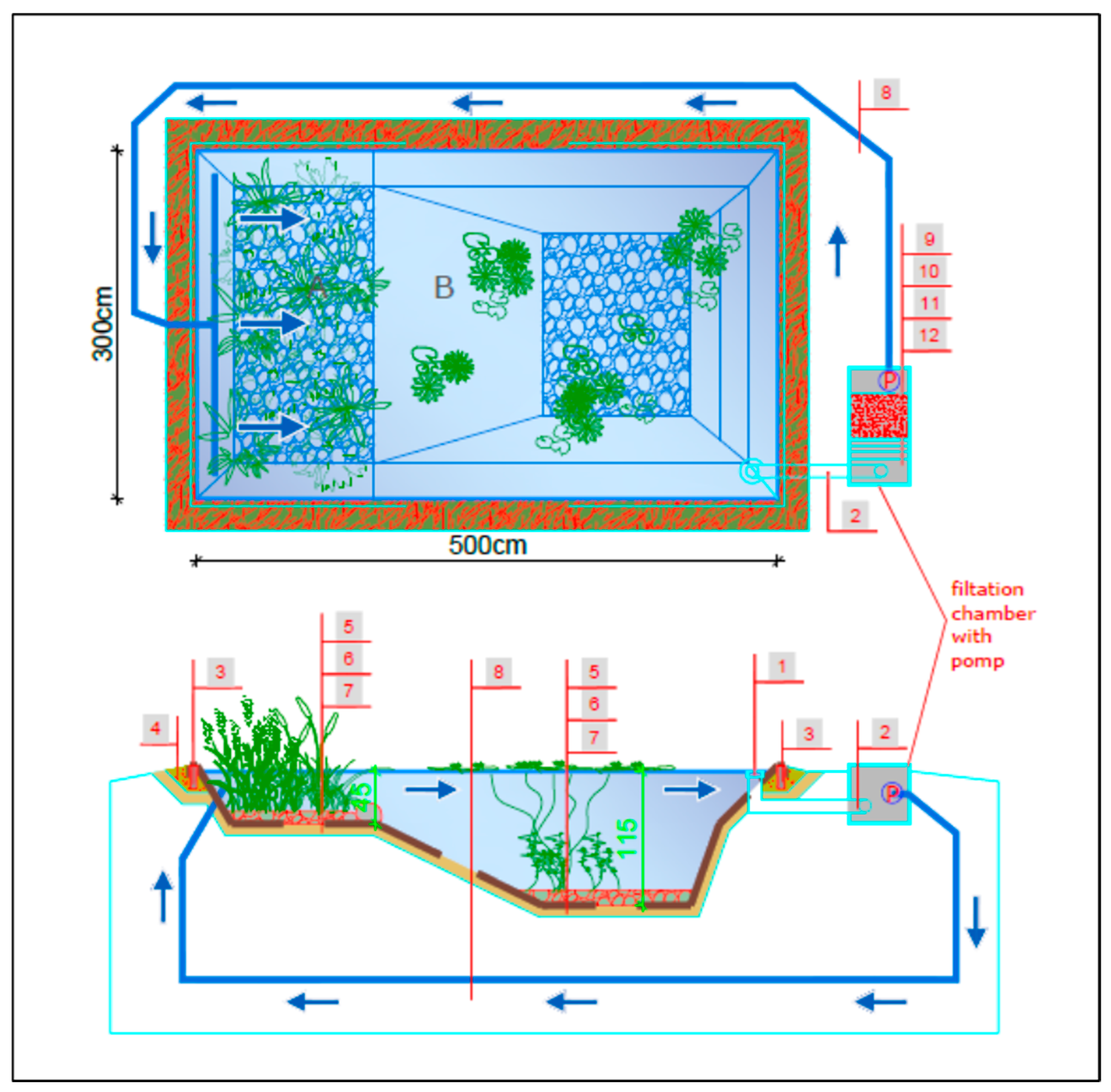 Therefore, the filtration efficiency of the prototype water treatment system described in the Materials section was tested for a full-size natural swimming pond type II (FSP).
