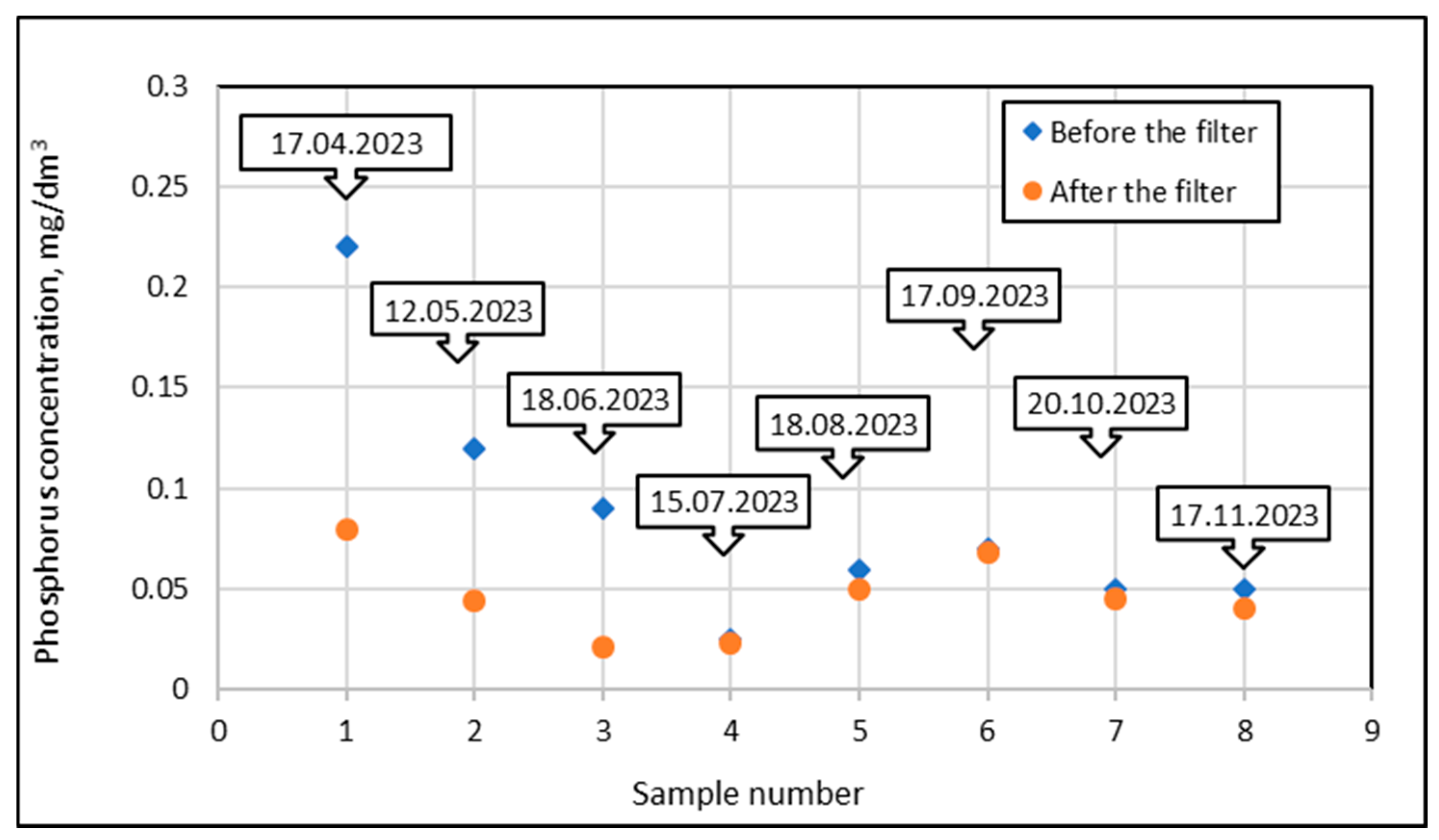 Low phosphorus concentrations in both pond water and filtered water, as well as natural inaccuracies in analytical tests, contributed to high standard deviations, while higher values of the mean compared to the median suggest a right-skewed distribution, i.e., a dominance of high values, which is also confirmed by further analyses of the bed’s adsorption capacity (below).