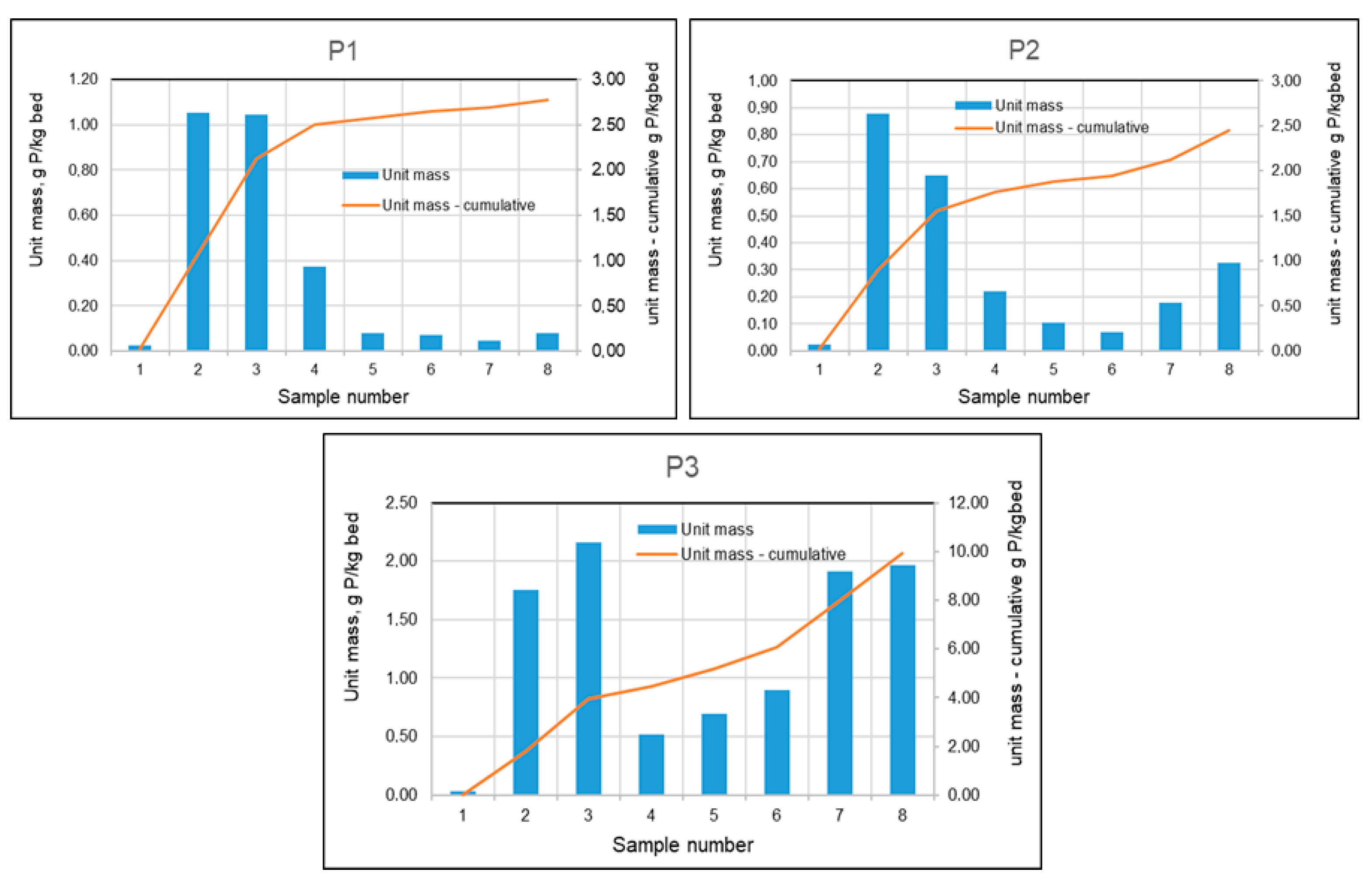 The calculations showed that 127.5 g of P entered the bed at that time, 46.5 g of P flowed out, which means that 81 g of P was retained in the bed.