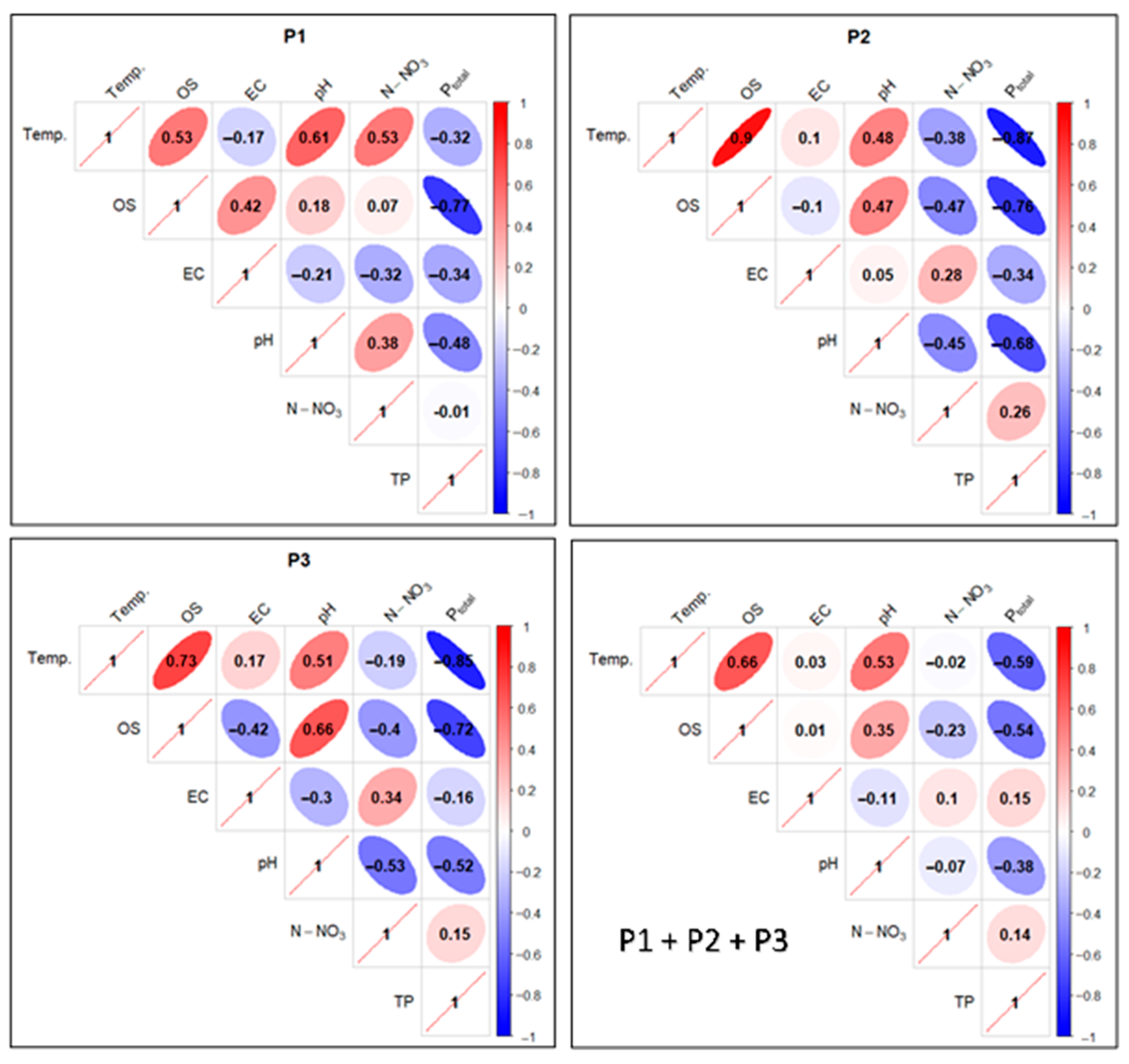 Collectively (P1 + P2 + P3), a high positive correlation was found for Temp. in relation to OS (0.66) and pH (0.53). For the pair Temp. and EC, the correlation was a low positive (0.03), and for Temp. in relation to N-NO