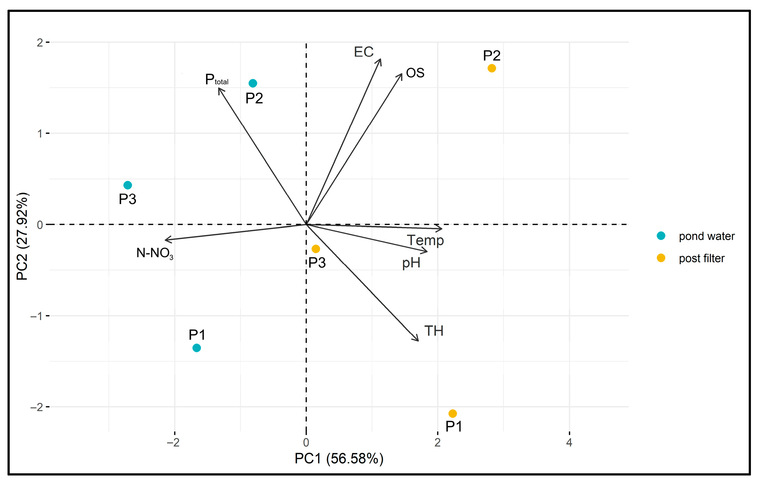 The water flow rates through the treatment system influenced the statistical analysis of the parameters in the water before and after mineral filtration. For the t-test (for normally distributed data) and for the Wilcoxon rank test (for variables that did not meet this assumption) at a significance level of 0.05, statistically significant differences were found for different parameters for different experimental ponds: P1 (5 m/h): Temp., TH; P2 (10 m/h): EC, Ptotal and OS (O2); and for P3 (15 m/h): EC, TH, Ptotal, N-NO3. It was observed that with an increase in the filtration circulation speed in the ponds, the number of factors whose values in the water before and after filtration showed statistically significant differences increased. Similar observations can be made in the case of principal component analysis (PCA) of the studied factors. It was found that the filtration process significantly affects the physicochemical properties of water. Perhaps the biophysical and chemical conditions in the pond waters with varying filtration flow rates created a diverse, multi-factor background for the course and intensity of internal metabolic processes in the studied reservoirs.