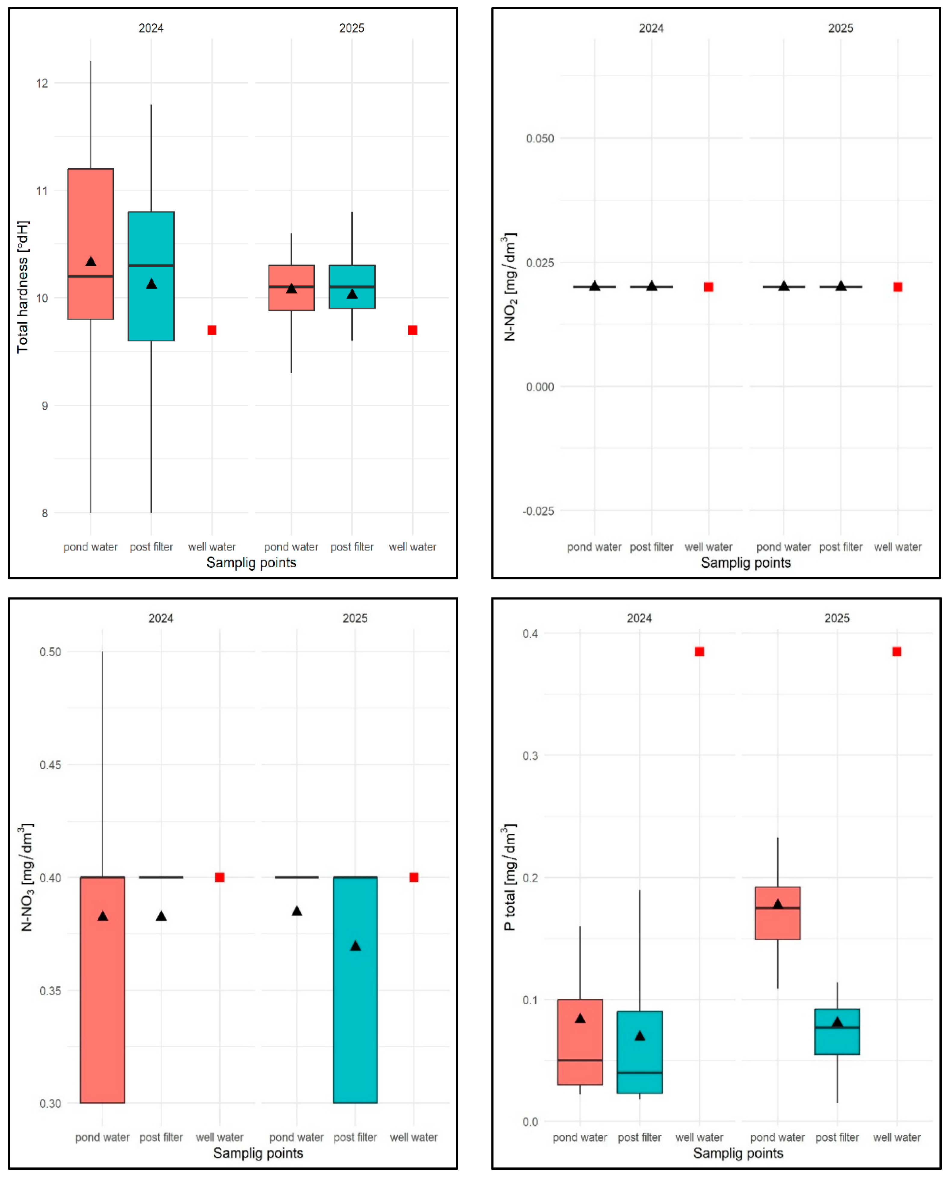 In the case of total water hardness (TH), the values ranged from 9.9 °dH (P1) to 12.4 °dH (P1), with an average of 10.97 °dH for the entire study period (average from pond water TH = 10.77 °dH, average from filtered water TH = 11.11 °dH) and were higher than for well water (9.9 °dH). The lowest average TH values were found for P3 (10.7 °dH) and the highest for P1 (11.14 °dH)—