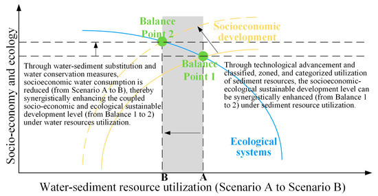 As illustrated in Figure 5, there is intense competition for water and sediment resources between socio-economic development and ecological conservation in the Jiziwan region (Table 3). However, through integrated management strategies, such as water-sediment exchange, water resources conservation, and graded/partitioned/classified sediment utilization, socio-economic water and sediment demands can be met without increasing overall consumption or inducing additional sediment-related risks (transitioning from allocation scenarios A to B). Furthermore, the socio-economic and ecological benefits of water and sediment resource utilization can be simultaneously improved, thereby facilitating synergistic development (transitioning from equilibrium points 1 to 2). The core strategy for integrated water-sediment allocation in this region is “sediment interception in exchange for water” [64]. Governance efforts aim to reduce sediment entry into river channels, thereby lowering the water volume required to transport sediment. The resulting water savings are then directed towards socio-economic development and ecological protection initiatives. Hence, the key to achieving sustainable socio-economic development and ecological health in the Jiziwan region lies in the scientific allocation of water and sediment resource utilization volumes and techniques, as well as in determining appropriate thresholds for water and sediment use (Table 3).