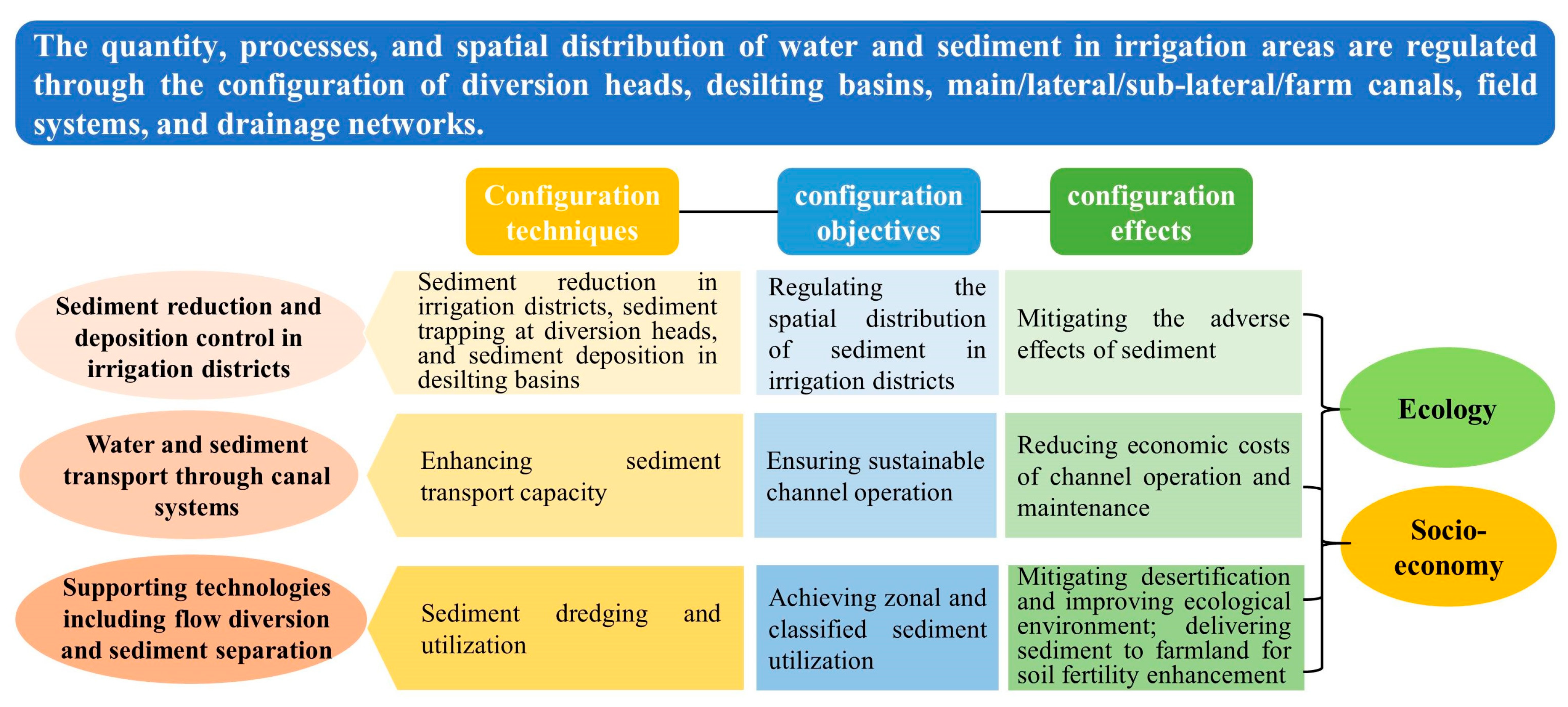 | Irrigation area | Regulating water-sediment processes entering irrigation districts. | Safeguarding agricultural production. | Regulating sediment discharge to mitigate land desertification and salinization issues. | The conflict between socio-economic development and farmland ecosystems over water resource utilization. | [36,50] |
