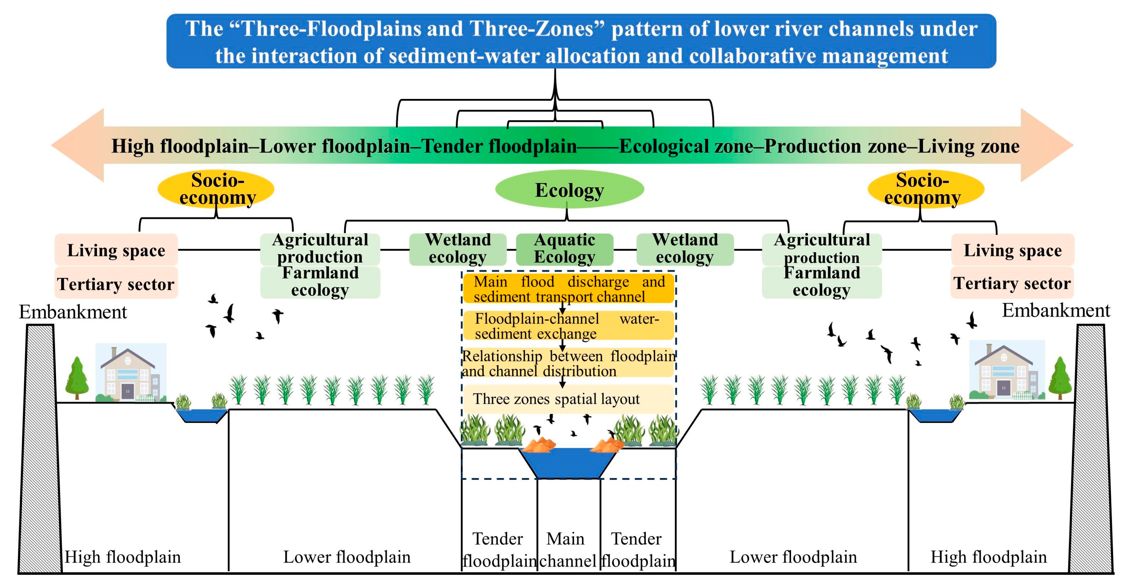 | Lower channel | Improving flood protection and alleviating suspended river conditions. | Protecting the lives and property of residents. | Regulating the water-sediment relationship and controlling the scope of sediment deposition to maintain a certain extent of wetland areas in the riparian zone and sustain agricultural ecological zones in the floodplain areas. | The contradiction between socio-economic development space and ecological space. | [39,53,54] |