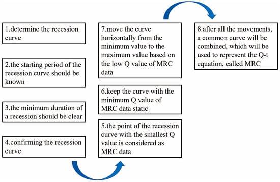 This article adopts some methods to construct and analyze the comprehensive drawdown curve. (1) Before constructing the comprehensive drawdown curve, it is necessary to determine the recession curve. To avoid the influence of noise on the flow data, a three-point moving average will be applied [45]. (2) The starting period of the recession curve should be known and considered to be when the ratio between continuous flows is less than zero (dQ/dt < 0) [46]. (3) The minimum duration of a recession should be clear and can be defined based on observations of streamflow sequence behavior and specific meteorological variables for each case studied [45,47]. If the start and duration can be confirmed, a recession curve will appear. (4) The matching strip method is used, which involves overlapping various recession curves to create a curve that represents the general behavior of the entire river flow data recession [46]. The matching strip method has the following steps: firstly, after confirming the recession curve, the point of the recession curve with the smallest Q value is considered as MRC data; secondly, keep the curve with the minimum Q value of MRC data static, and then move the curve horizontally from the minimum value to the maximum value based on the low Q value of MRC data. When moving, the position of the last curve with the same Q value as the MRC data of the curve to be moved should be found first. Then, the curve should be moved until its MRC data is the same as the point with the closest horizontal distance from that position to the previously mentioned position. If the position mentioned earlier cannot be found, the position of the curve point with the highest Q value will be considered as the position that should be found. (5) After all the movements, a common curve will be combined, which will be used to represent the Q-t function, called MRC (Figure 2). The functions in the table below (Table 2) will be used for matching and analyzing MRC.