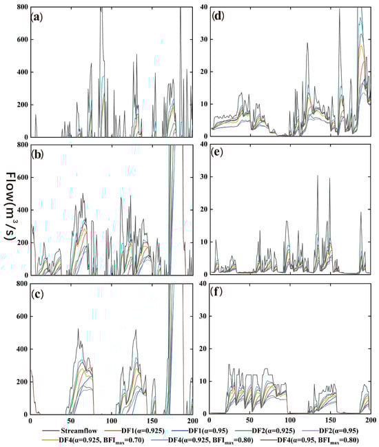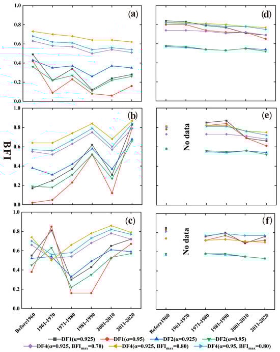 The BFI of different methods at different times. (a) The basin between Longmen hydrological station and Toudaoguai hydrological station. (b) The basin between Huayuankou hydrological station and Longmen hydrological station. (c) The basin between Huayuankou hydrological station and Toudaoguai hydrological station. (d) Fen River Basin. (e) Beiluo River Basin. (f) Yi River Basin.
