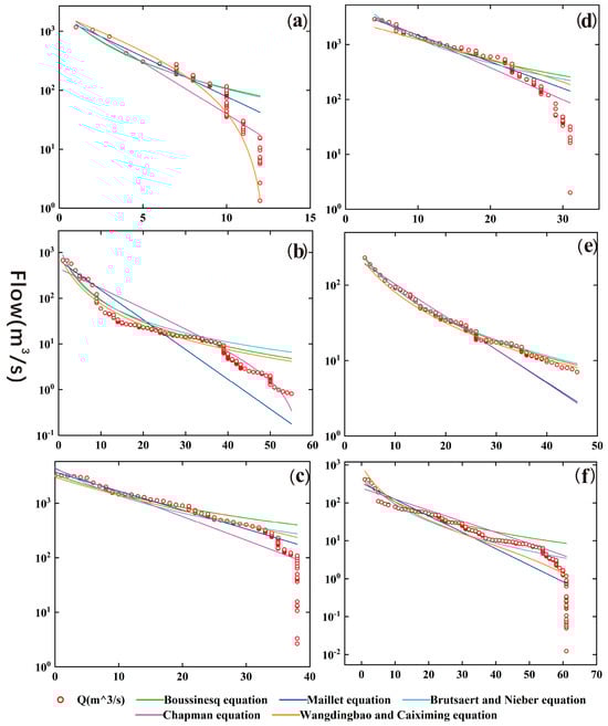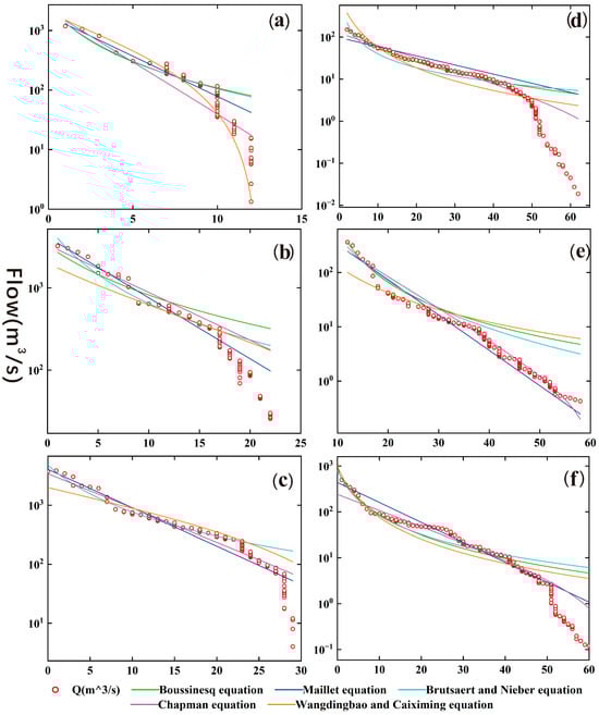 The data points in Figure 5a of the figure (Figure 5) exhibit a significant, abrupt downward trend at the tail end. Except for the Wangdingbao and Caiximing functions, which can fit the tail-end downward trend, all other functions can only match the front-end trend of the data. From the graph, it can be seen that the Boussinesq function, Maillet function, Brutsaert and Nieber function, and Chapman function all show a decreasing slope trend. In contrast, the Wangdingbao and Caiximing functions show an increasing slope trend. In terms of fitting degree, the Boussinesq function has a better fitting degree; the data points in Figure 5b show a significant, abrupt downward trend after time 40. From the graph, it can be seen that the Boussinesq function, Brutsaert and Nieber function, and Wangdingbao and Caiximing function all have a decreasing slope. In contrast, the Maillet function and Chapman function have an increasing slope. In terms of fitting degree, the Boussinesq function, Brutsaert and Nieber function, and Wangdingbao and Caiximing function fit better, while the Maillet function and Chapman function deviate far from the data points and fail to fit the data points well; the data points in Figure 5c show a significant, abrupt downward trend at the end. From the graph, except for the Chapman function, all other functions show a decreasing slope. In terms of fitting degree, the Boussinesq function, Maillet function, Brutsaert and Nieber function, and Wangdingbao and Caiximing function fit better, while the Chapman function can only fit a small number of data points. The data points in Figure 5d show a significant, abrupt downward trend at the end. From the graph, it can be seen that all functions have a decreasing slope. In terms of fitting degree, except for Chapman’s function, the fitting degree of other functions is very high, which can match the vast majority of data points. Except for the data with an abrupt downward trend at the end, the data can basically fall within the range of the fitting function. The data points in Figure 5e are different from those in other figures, and there is no abrupt decrease in the tail end. From the figure, all functions show a decreasing trend in slope. In terms of fitting degree, except for Chapman’s function, the other functions can basically fit all the data points and perfectly match all the experimental data. Currently, the fitting situation in this figure is the best among all the figures; the data points in Figure 5f exhibit a sudden decrease at time 60. From the graph, it can be seen that all functions show a decreasing slope trend. In terms of fitting degree, almost all functions have a certain degree of fitting difference, and there are cases of fitting mismatch. Relatively speaking, Brutsaert and Nieber function, Maillet function, and Wangdingbao and Caiximing function fit better.