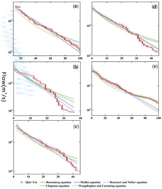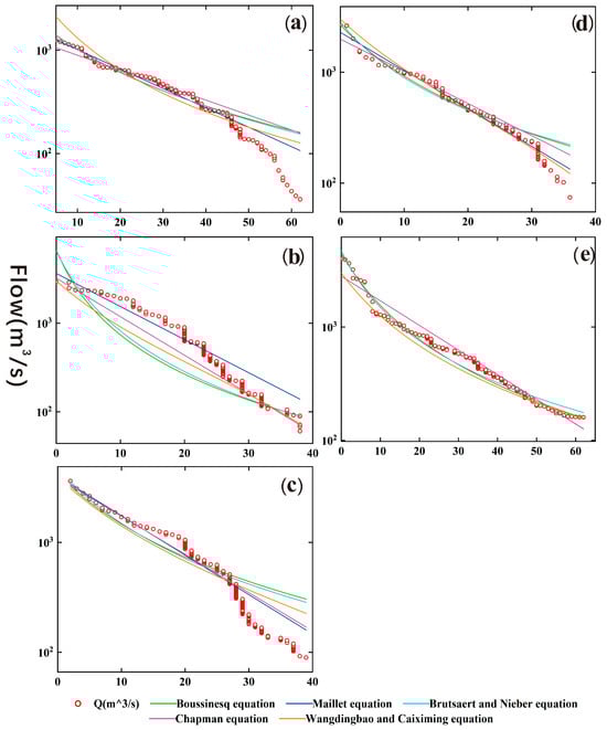 The data points in Figure 7a of the figure (Figure 7) are smooth and continuous, with little decrease at the end. Except for the Maillet function, which can fit the downward trend at the end, all other functions can only match the front-end trend of the data. From the figure, the Boussinesq function, Maillet function, Brutsaert and Nieber function, and Chapman function all show a decreasing slope trend. In contrast, the Wangdingbao and Caiximing functions show an increasing slope trend. In terms of fitting degree, the Maillet function has a better fitting degree; the data points in Figure 7b show a significant, abrupt downward trend after time 25. From the graph, it can be seen that the Boussinesq function, Brutsaert and Nieber function, and Wangdingbao and Caiximing function all have a decreasing slope. In contrast, the Maillet function and Chapman function have an increasing slope. In terms of fitting degree, the Boussinesq function, Brutsaert and Nieber function, and Wangdingbao and Caiximing function fit better, while the Maillet function and Chapman function deviate far from the data points and fail to fit the data points well; the data points in Figure 7c show a significant, abrupt downward trend at the end. From the graph, except for the Chapman function, all other functions show a decreasing slope. In terms of fitting degree, the Boussinesq function, Maillet function, Brutsaert and Nieber function, and Wangdingbao and Caiximing function fit better. In contrast, the Chapman function can only fit a small number of data points. The data points in Figure 7d show a significant, abrupt downward trend at the end. From the graph, it can be seen that all functions have a decreasing slope. In terms of fitting degree, except for the Maillet function and Chapman function, the fitting degree of the other functions is very high, which can match the vast majority of data points. Except for the data with an abrupt downward trend at the end, the data can basically fall within the range of the fitting function. The data points in Figure 7e are different from those in other figures, and there is no abrupt decrease in the tail end. From the figure, all functions show a decreasing trend in slope. In terms of fitting degree, except for the Maillet function and Chapman function, the other functions can basically fit all the data points perfectly, matching all the experimental data. Currently, the fitting situation in this figure is the best among all the figures.