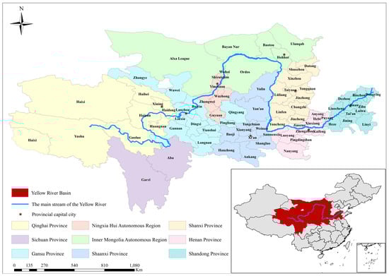 The Yellow River, renowned as the fifth-longest river in the world and the second- longest in China, spans an impressive 5464 km and covers a basin area of approximately 752,443 km2. It originates from the Bayan Har Mountains’ northern foothills on the Qinghai–Tibet Plateau and flows through nine provinces: Qinghai, Sichuan, Gansu, Ningxia, Inner Mongolia, Shanxi, Shaanxi, Henan, and Shandong, before emptying into the Bohai Sea [9,36]. This study focuses comprehensively on the entire YRB, aiming to thoroughly analyze the socio-economic landscape and water environment quality throughout 2022 and their interrelated dynamics.
