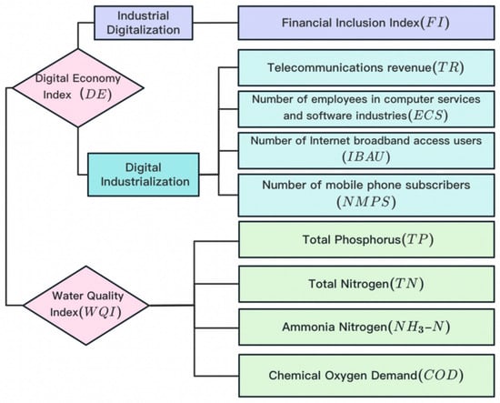 To comprehensively assess the interplay between the digital economy (DE) and water environmental quality in the YRB, a composite index system was constructed for each domain (Figure 2). The construction process followed a structured approach: indicator selection, standardization, dimensionality reduction/integration, and index formulation, as detailed below.