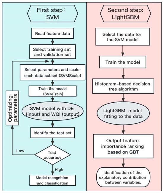 This study investigates the complex interactions between the digital economy and water quality by leveraging machine learning techniques capable of capturing non-linear relationships among multifaceted variables. A novel dual-engine framework integrating Support Vector Machines (SVM) and Light Gradient Boosting Machines (LightGBM) is proposed to quantitatively assess these connections. SVM is employed to delineate spatial relationships between digital economy indicators and water quality under limited sample availability, while LightGBM identifies key driving factors and their contributions to changes in water quality. The model incorporates five digital economy input variables and four water quality output indicators. The overall technical workflow is illustrated in Figure 3.