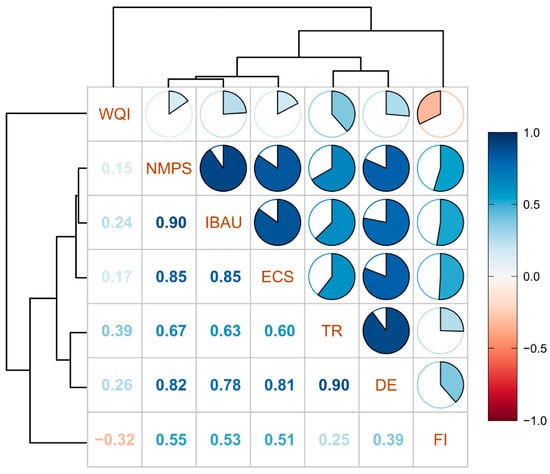 Conversely, FI exhibited a negative correlation with WQI, the correlation coefficient was −0.3. This suggests that in some contexts, advancing financial inclusion may inversely relate to water quality. This finding highlights a potentially complex, nuanced relationship between digital economy dimensions and environmental quality.
