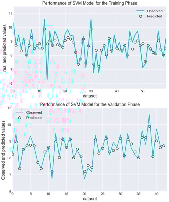 Figure 8 and Table 1 summarize the training and validation results of the SVM model, demonstrating its simulation accuracy. The NSE values for the entire period, training period, and validation period were 0.858, 0.891, and 0.710, respectively. These NSE values indicated strong model performance across periods. Similarly, the R2 values for these periods were 0.853, 0.809 and 0.767. These R2 values reinforced the model’s accuracy, confirming its effectiveness in predicting water quality based on digital economy variables. The RMSE values were 0.622, 0.493, and 0.848 for the entire period, training period, and validation period, respectively. These values suggested reasonable performance across periods [32,33,34]. The MAPE values were 0.171, 0.170, and 0.172 for the respective periods. Consistent MAPE values indicated that the model maintained similar accuracy across analysis phases. The Coef values of the model for the entire period, training period, and validation period were 0.930, 0.956, and 0.868, demonstrating robustness and reliability over time (Table 2). Collectively, these results showed that the SVM model achieved average fitting coefficients exceeding 0.85 for the entire period, 0.80 for the training period, and 0.70 for the validation period. The minimal relative error between predicted and observed values confirmed a mathematical relationship between digital economy indicators and water quality parameters [33,34,35].